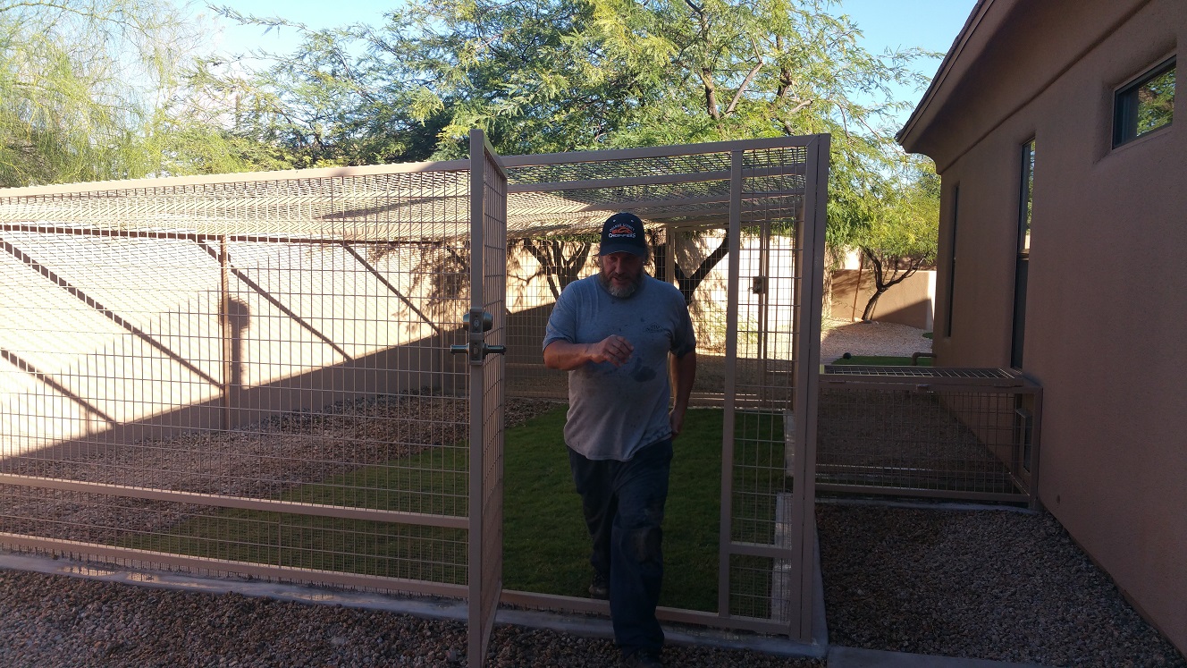 Dog Runs Installed In Arizona!Not all Arizona companies that install dog runs in Phoenix are alike. We believe that integrity and customer satisfaction is more important than profit and sales. We will never try to sell you a dog run that is larger than more expensive than one that is more suitable for your needs. Example: The custom built dog run shown on this web page is NOT designed for dogs under 50 pounds. We recomend kennels with wired tops or solid roofs for smaller dogs as they are subject to harm from hawks, coyotes, bobcats, and other preditors. We cover the entire Phoenix Metro Area market plus many other areas of Southern Arizona. We install dog runs for sale in gated communities, ranches, Million Dollar Homes in AZ! Our Arizona Pet Enclosures Set The Standard for Excellence. Please Note: Larger Arizona Dogs are NOT exempt. In Phoenix if you have one or more large female dogs that have not been spade. The Recently Evolved Urban Coyotes are now copulating with domesticated dogs creating canine hybrids refered top as "Coy Dogs" or "Dog Yotes". Considering that Coyotes (The Name Coined By The Mighty Navajo Nation Many Moons Ago.) for all of you that have recently moved to Arizona and forgot to check your politics at the State Line. (That's NOT a Racist Remark to those of you who are Politically Correct and Letigious in nature). I grew up on the Navajo reservation and the Navajo are a Fine, Genteel, and Proud Tribe. I Digress. If you have recently moved to Arizona and you have small dogs or cats. We are THE BEST HOPE that your pets have. Our Utmost goal is to keep your pets safe from coyotes, bobcats, other agressxive dogs, mountain lions, hawks, owls, snakes, and/or any other predator that may endanger your dogs or cats safety. We can install a dog kennels and run in the Phoenix area that will protect your pets, 100% GUARANTEED! You can not find better quality or workmanship Anywhere! We only use the best materials and heavy duty steel made in the USA and try to hire Vets whenever possible. We only use certified welders that are American citizens. We focuse on installation of The Absolute Best runs for dogs and other Top Quality custom built animal containment systems with your pet's safety in mind. We will submit detailed drawings and information on your Arizona dog runs including square footage, design, color, floor plans, and material used before any work is done. We can build and install pet kennels for any size animals from Large Aggressive Dogs to Small Chihuahuas and Cats. Please feel FREE to bookmark our CONTACT US page if you ever feel that your pets safety may be at risk or in jeopardy. There are many Phoenix companies that sell and install runs for dogs but our animal containment systems are Second to None! Let us design for you a unique and distinctive home for your pets that you can be proud of for years to come. We install custom built dog runs that can accommodate any size or breed. For over 10 years we have installed all types of enclosures from Arizona dog breeders to private owners in Maricopa County including neighboring communities such as Scottsdale, Paradise Valley, Glendale, Tempe, Mesa, Phoenix, and Fountain Hills. Many of our top quality kennels for dogs are Exclusive Designs not found elsewhere. Your Choice of Grass or River Rock Floor Snake Proof Wire Is Set In Concrete To Keep Snakes OUT! Don't settle for Arizona kennels that are not safe for dogs. Since 2008 we have custom built and installed over 2,000 dog kennels and runs but not one has ever been breached. There are many Phoenix companies that offer installation of dog runs and kennels. We fabricate from welded steel all shapes and sizes of unique and beautiful enclosures for All Breeds of Dogs and Cats that all have distinctly different characteristics. No pet has EVER been harmed by predators using our EXCLUSIVE Designed kennels. If you are looking for the best Arizona company that installs kennels, and runs for dogs or other pet enclosures. Call us for a FREE ESTIMATE at (520) 730-7020. This is the "Go TO" website for the BEST QUALITY DOG RUNS on the Arizona market. We build, fabricate, sell and install Arizona dog runs & kennels for every taste and budget. Our Certified Welders Are VETS!An Arizona Owned Dog Run Company Since 2008 |
